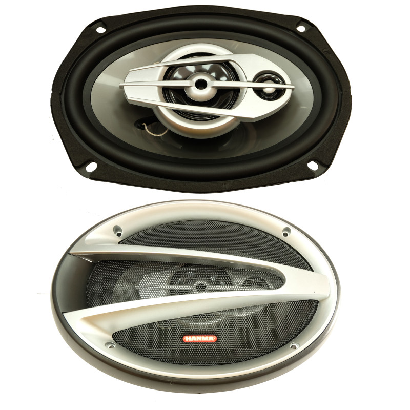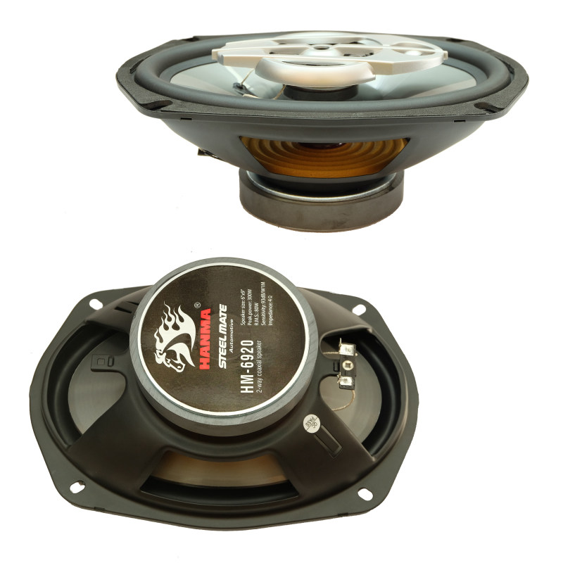 بلند گو و اسپیکر خودرو ساخت شرکت استیل میت با برند هاناما دارای خروجی ۳۰۰ وات سایز ۶ در ۹ تعداد در بسته ۲ عدد